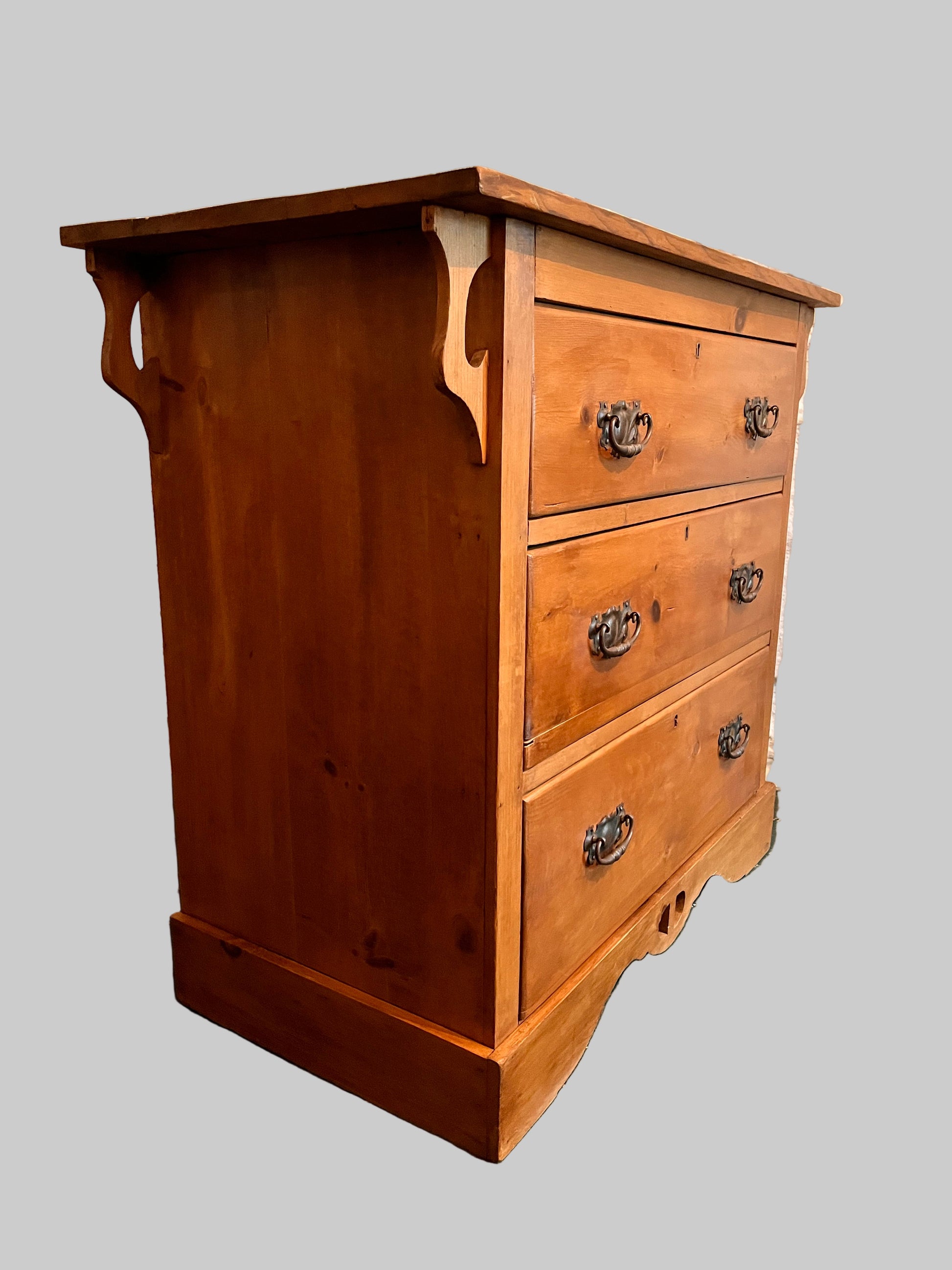 A neatly proportioned art nouveau pine chest of drawers. This elegant antique piece features three long, graduating drawers, each fitted with drop handles. Raised in a shaped plinth base, it is finished with a flat edge top, beneath which are beautifully shaped brackets, adding an interesting art nouveau style to its design.