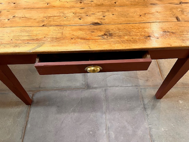 This distinguished pine farmhouse table showcases authentic period character with its richly patinated surface and classically proportioned square legs finished in complementary paint. The waxed top reveals the wood's natural grain and subtle colour variations that photography struggles to capture. A generous front drawer provides practical storage for table linens and dining accessories, combining functionality with timeless design. An exemplary piece for those seeking genuine vintage appeal with everyday utility.